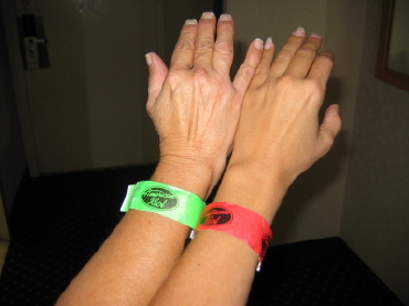 In order to be an Idolitioner or an Idolitioner's guest, you have to have a wristband. People wait in line for these all day and night. However, it is possible to receive a wristband anytime between 6:00 A.M. before the day of auditions all the way up to the moment of auditions. This photo shows Mom's wristband (green), and mine (pink or red, depending on your perspective). |