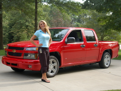 It's Fall—my favorite season! And what better way to celebrate than with... A NEW CAR! Actually, it's a new truck. The Sunfire was a great buddy for 10 years, but it was time for something new, and new it is! I purchased a 2006 Red Chevy Colorado. I ♥ it! Big Bad Red is pictured with me to the right. I've included a bonus picture of my Sunfire that was taken in 1997. Dad helped me simulate the old picture (minus me wearing a Prom dress). I spent a lot of time in the new truck this morning; Mom and I drove to Indy for the