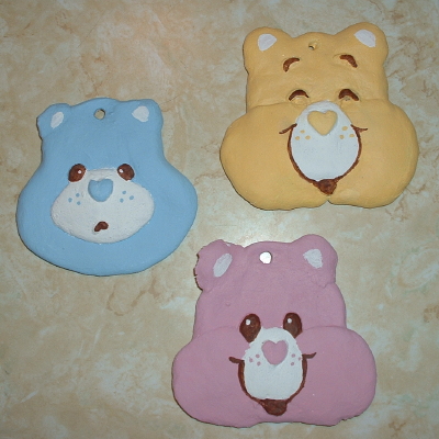 The Twelve Days Of Christmas. Keeping with the Christmas spirit, I've posted some pictures of some of my Christmas decorations to the left. The top picture shows my Care Bear Christmas tree, and the bottom picture shows some salt dough ornaments I made to put on that tree. In addition to the Care Bear tree, I have patriotic and traditional trees too. Now all I need is a beach tree! Speaking of Care Bears, I hope to make my own Care Bear web site someday. However, between