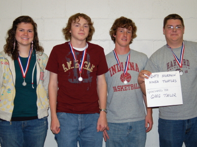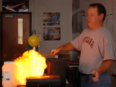Eighth grade Science is much cooler than it was when I was in school! Ed is in the process of teaching his classes to balance chemical equations. To make it more interesting, he showed them that when you combine zinc and hydrochloric acid, the result is zinc chloride and hydrogen gas. He captured the hydrogen in a balloon, then showed the effects of combining hydrogen with an open flame. BOOM! The kids loved it. I went upstairs to see it twice, and even brought one of my classes to watch. In other news, Sam is on BNL's yearly wall-of-fame as a receiver of 2007 All-Conference honors. His grandpa took the pic, and I love it! Also, check out the two new
