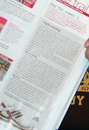 their web site to see the rest of my essay. Unfortunately, it's not there. That's kind of a bummer, but it's still very cool to see my essay in the magazine and to know that my Adidas loot will be here soon! Incidentally, one year ago November 19 is my run-iversary—one year of running fun! |