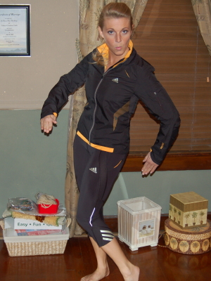 the 10K! I was very nervous at the beginning of the race because I've been having some trouble with my left leg, which I've aggravated due to the problem with my right hip. I was able to cope with the pain, which wasn't too bad, and finish in 57:03 for another PR and one of the most enjoyable races I can remember. My goal was to break an hour, so I was thrilled! It was a great day for a race—sunny, 40°, and very little wind. My friend Robin also PR'd with a 46:03. The only bad part of the day was accidentally wearing my new Adidas pants backwards and not noticing until afterwards! I made a
