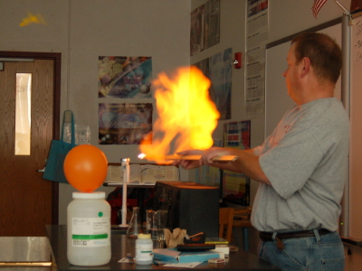 Little Nashville Opry this season, I knew I had to get tickets—and great tickets they were! As Ed and I were getting ready to sit in our fourth row seats, Jim (one of the owners), asked us if we wanted to go backstage to meet Bucky. Um, YES! We didn't have our camera, so we used Ed's cell phone to get a picture of the meeting. Neat! The concert was high-energy and entertaining, so we ended up having an all-around fabulous evening! The day before, Ed did his annual exploding hydrogen demonstration. He uses a chemical reaction of zinc and hydrochloric acid to fill a balloon with hydrogen gas. Then he brings a flame near the balloon and—BOOM!—explosion. (The picture I got